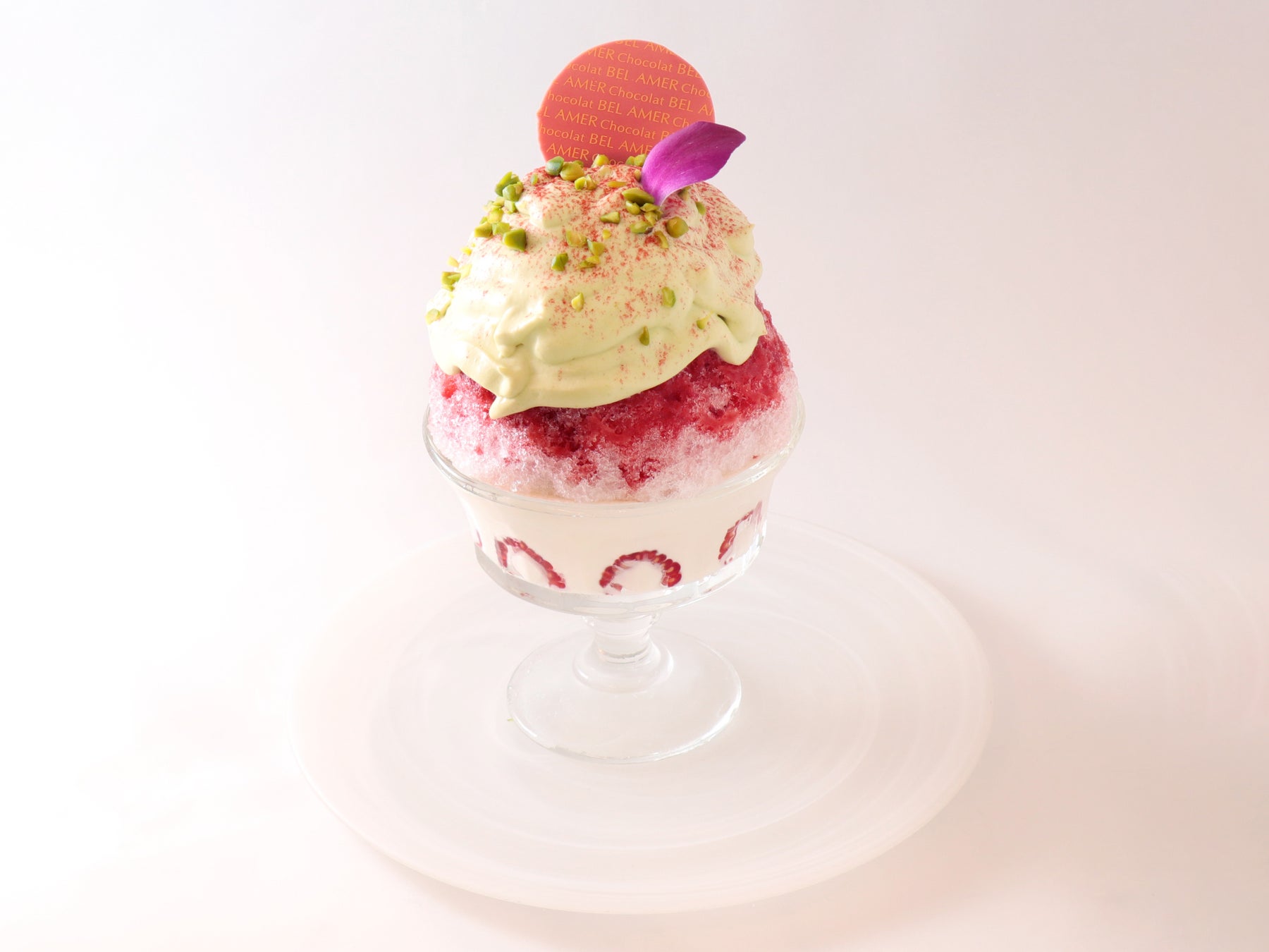 氷の上に甘酸っぱいフランボワーズのシロップとコクのあるホワイトチョコとピスタチオのクリームを重ね、中にはピスタチオのアイス、生クリーム、フランボワーズを詰め込みました。