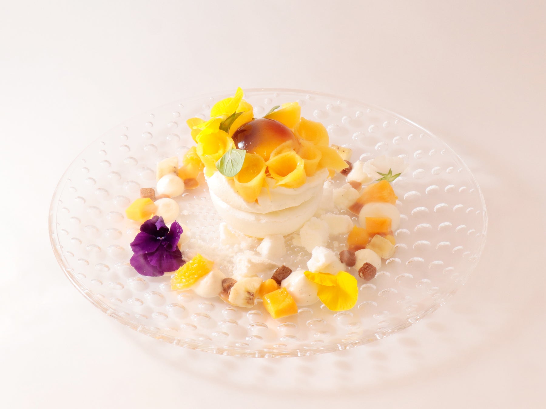 球体のメレンゲの中にトロピカルフルーツのソルベを詰め、上には数種のハーブのジュレを合わせ、フレッシュのマンゴーを飾り付けました。