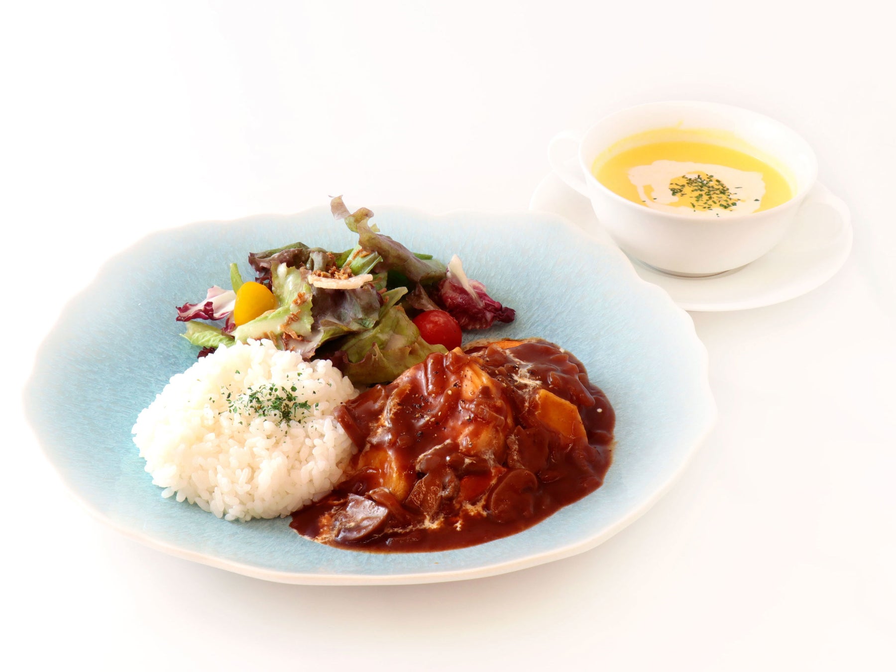 コクのあるデミグラスソースをかけ、ライス、サラダ、季節のスープを添えたランチセットです。