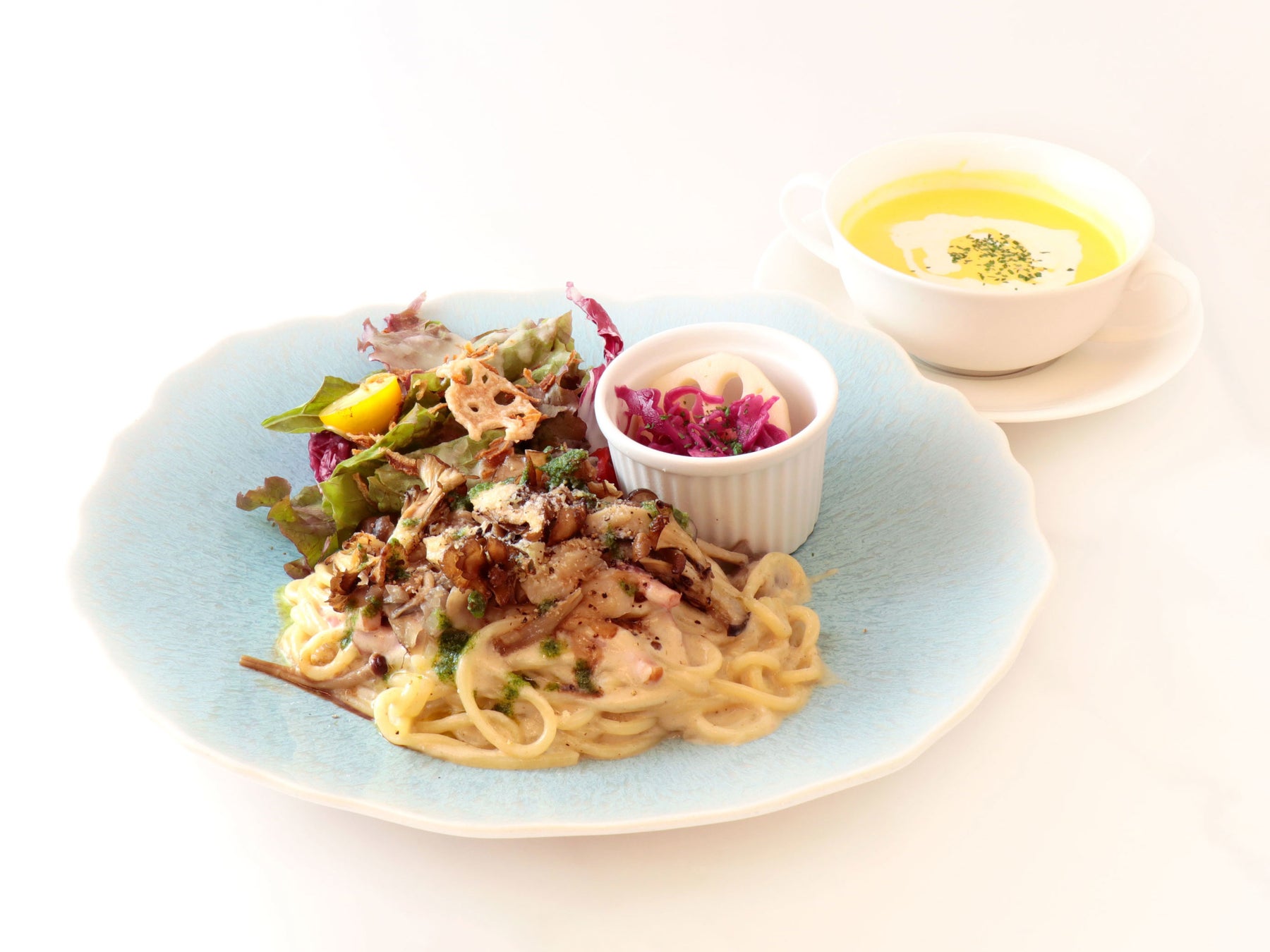 サラダと野菜のマリネ、季節のスープを添えたランチセットです。
