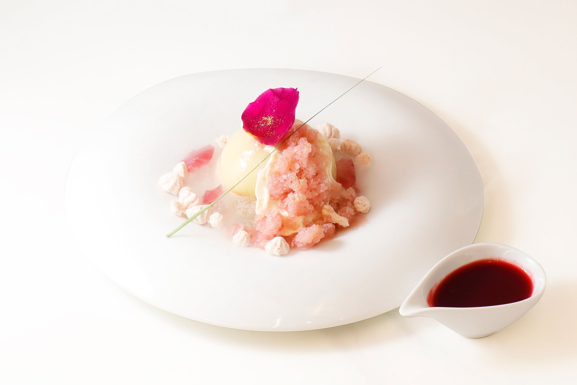 トップには桃のグラニテと液体窒素にくぐらせた桃のメレンゲがひんやり涼しげな夏にぴったりの一皿です。お好みでバラのソースをかけてお召し上がりください。