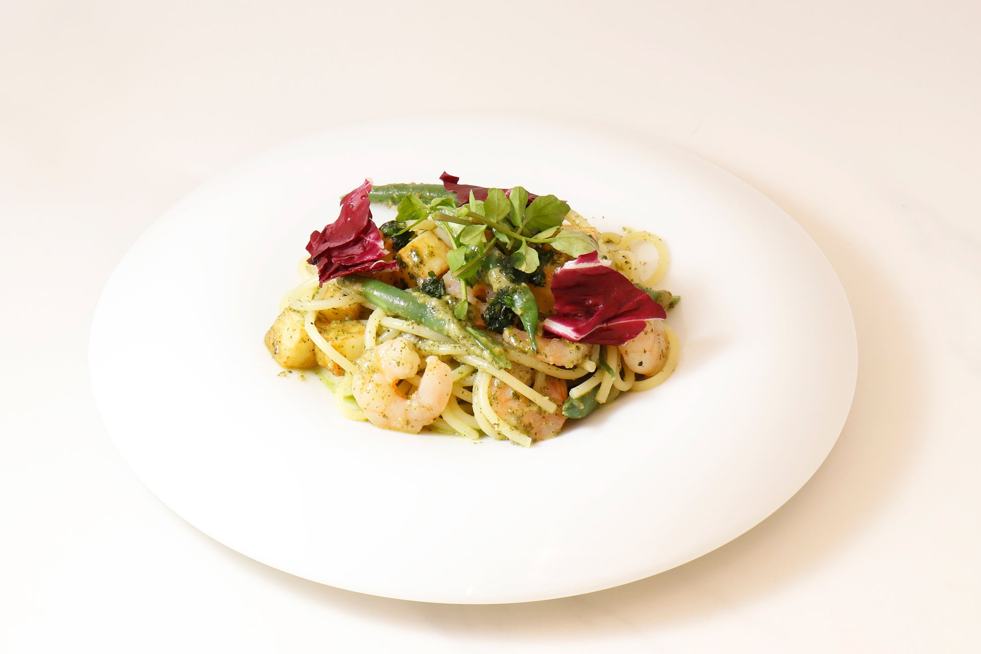 ぷりぷりのエビといんげんを色鮮やかなバジルソースと絡めました。