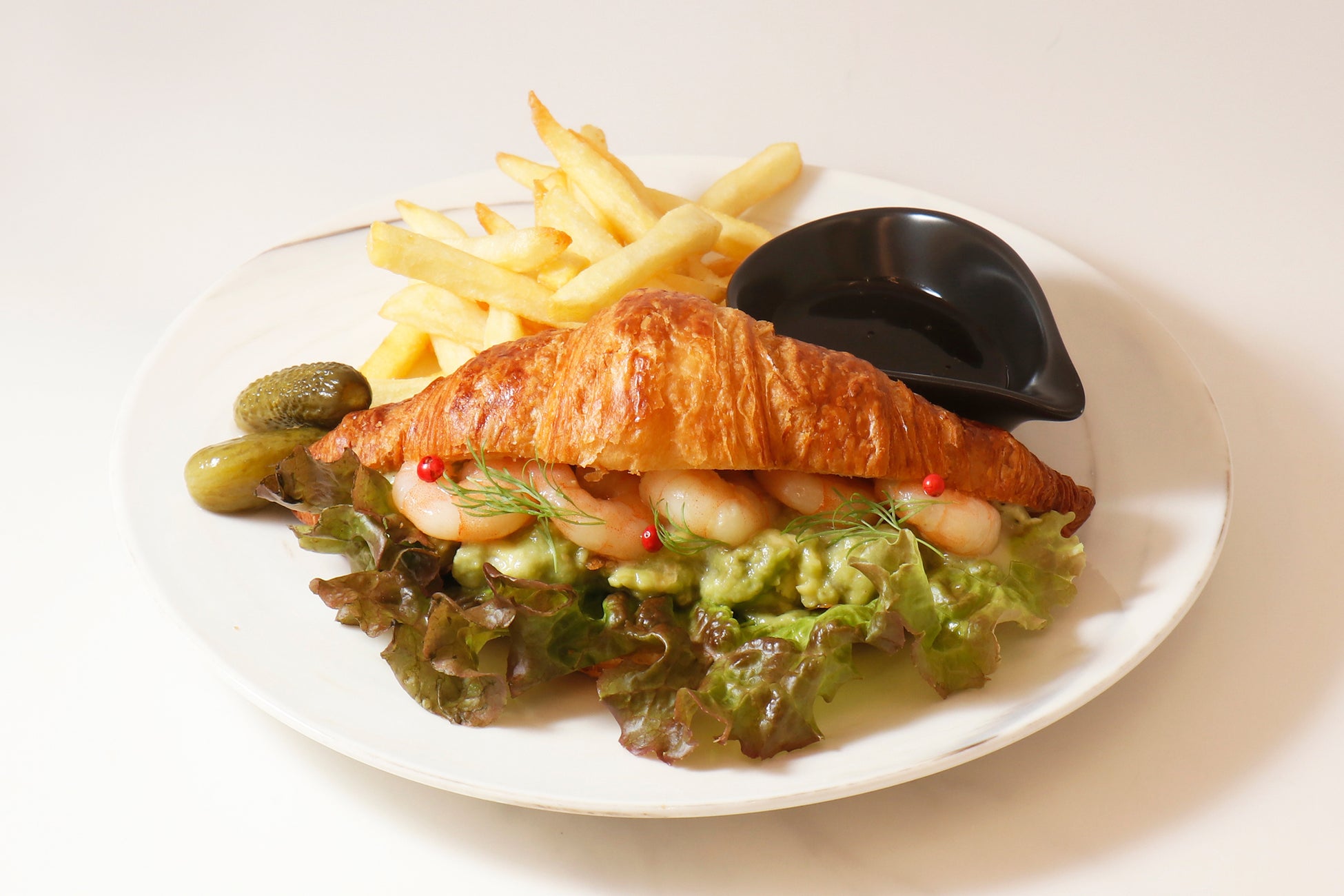 ハニーマスタードソースと、アボカドをたっぷり使ったワカモレフィリングでサンドしたクロワッサンサンドイッチです。