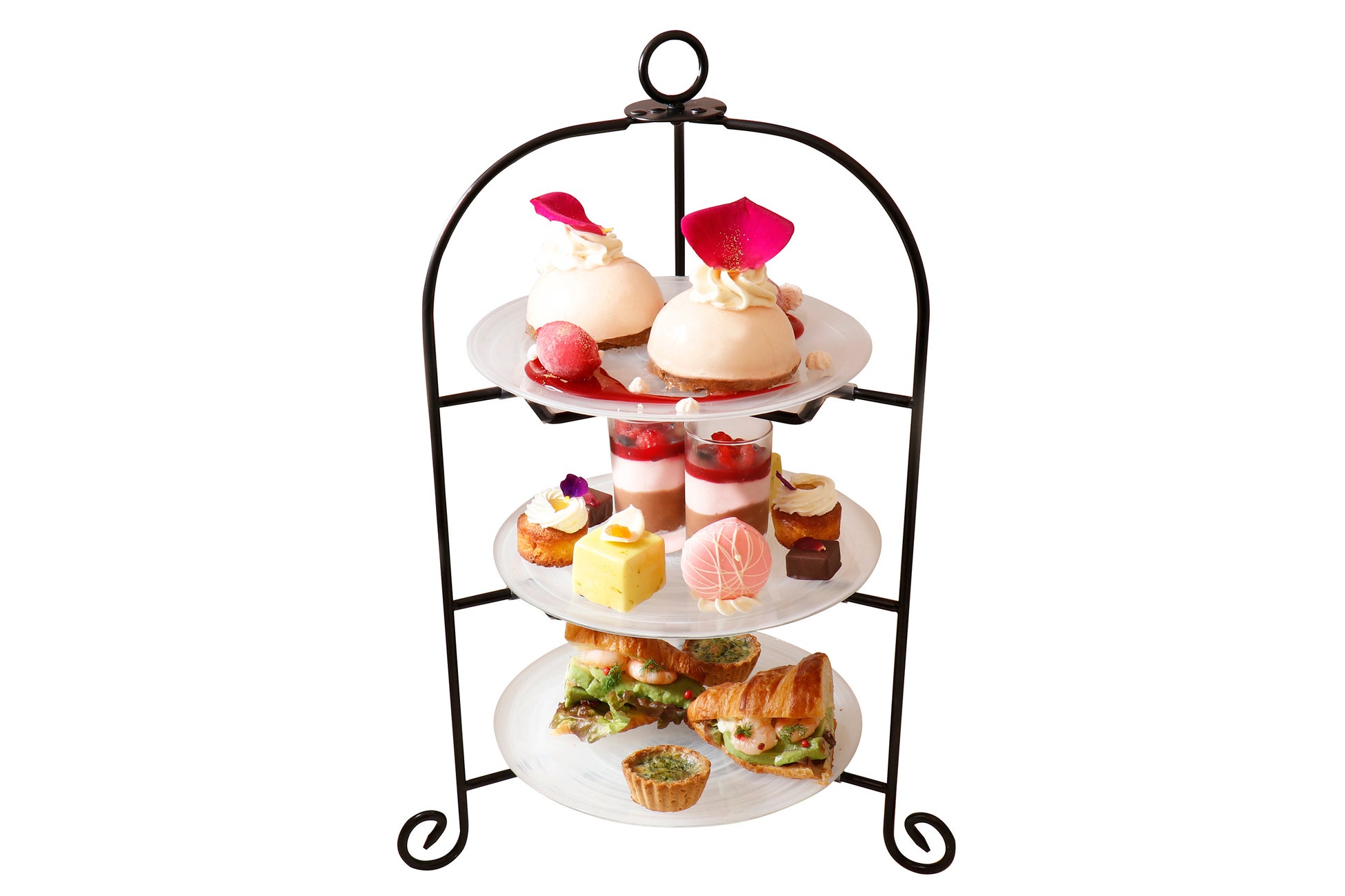 中段にはローズとベリーのショコラベリーヌ、ピスタチオとアプリコットのケーキ、桃のマカロン、ココナッツとレモンのケイク、ボンボンショコラ、下段にはサンドイッチやミニキッシュを盛り合わせました。