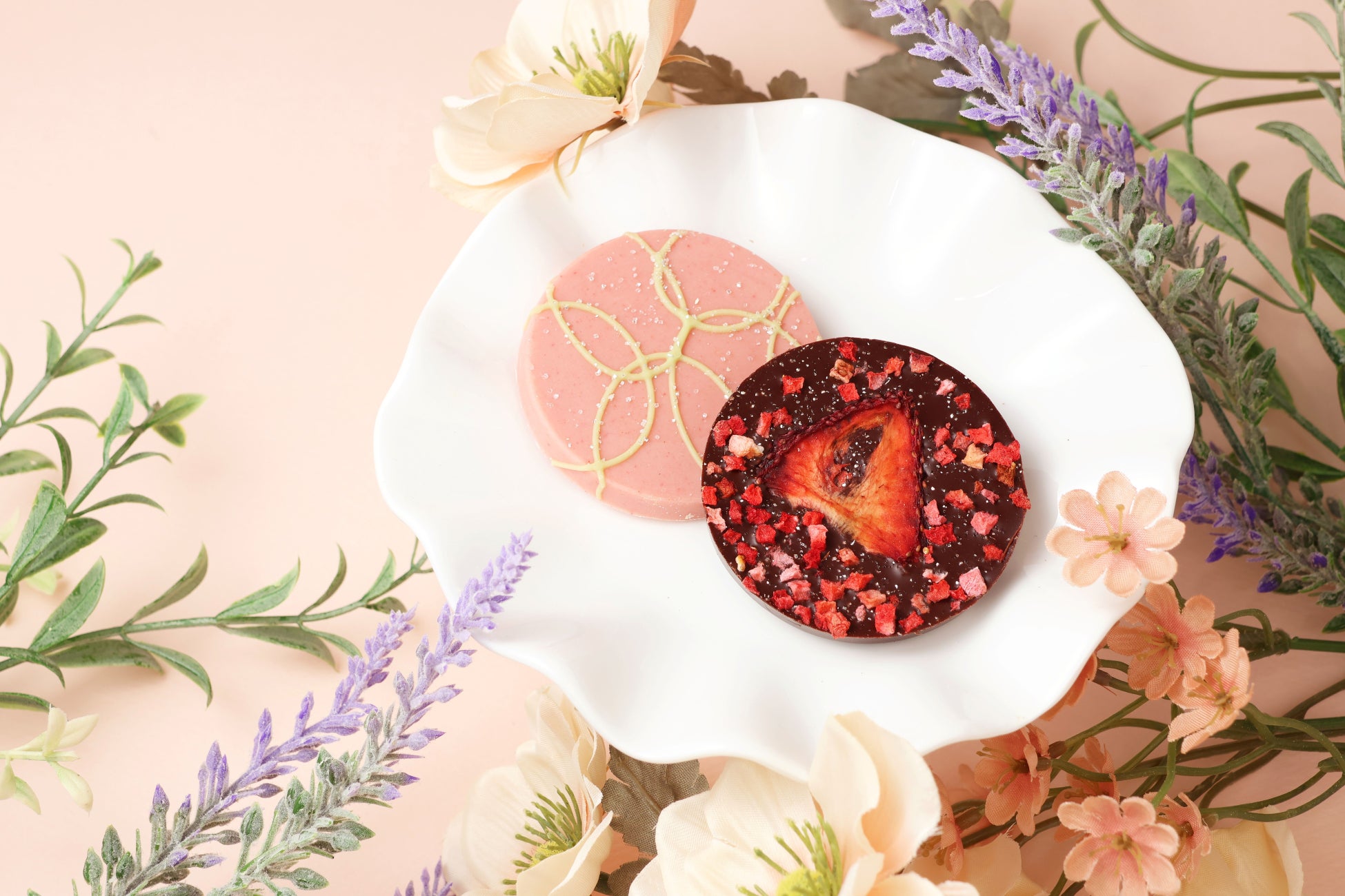 苺風味のビターチョコにドライ苺をトッピングした「フレーズフレーズ」、苺風味のホワイトチョコにピーチジュレをしのばせた「ピーチベリー」。