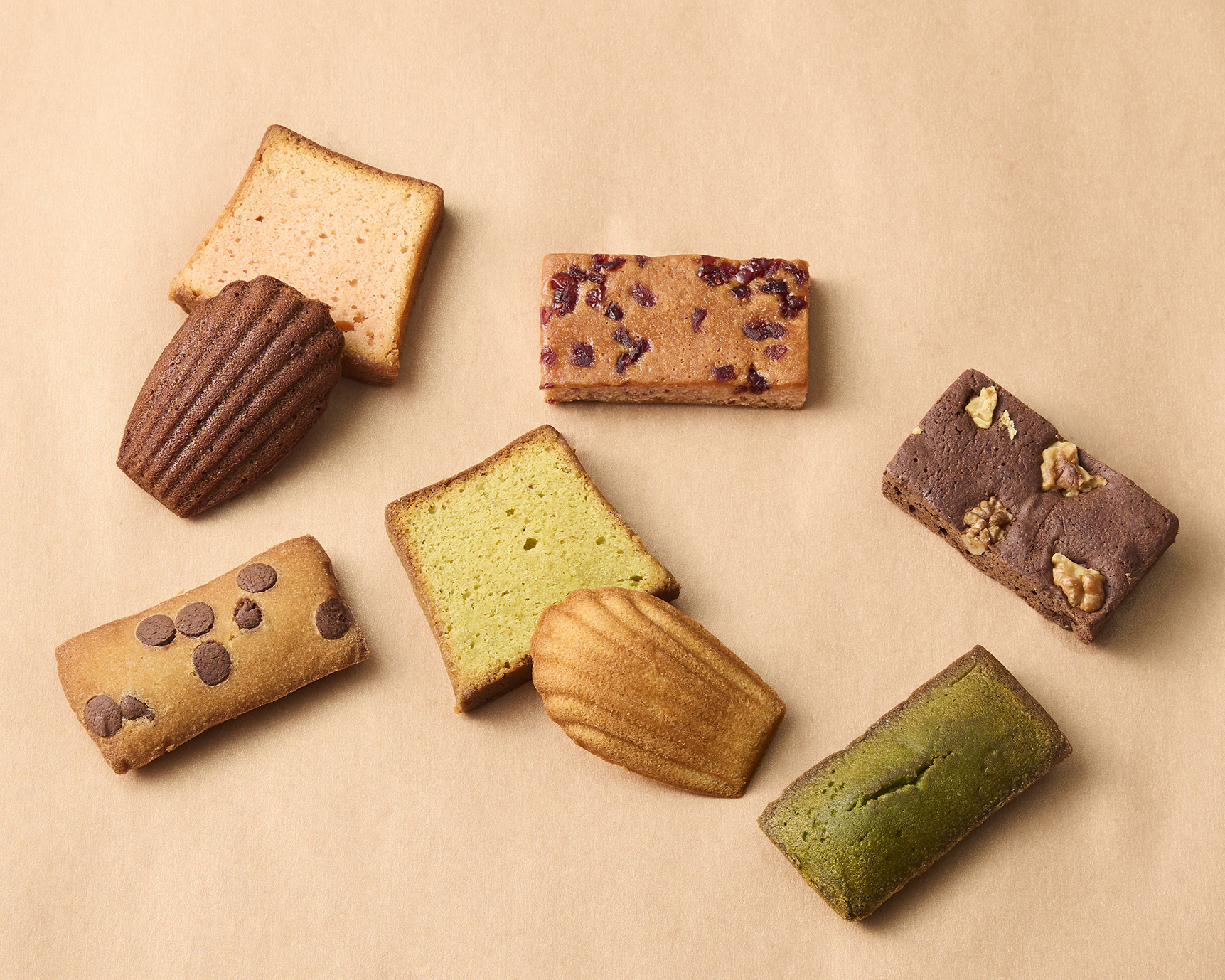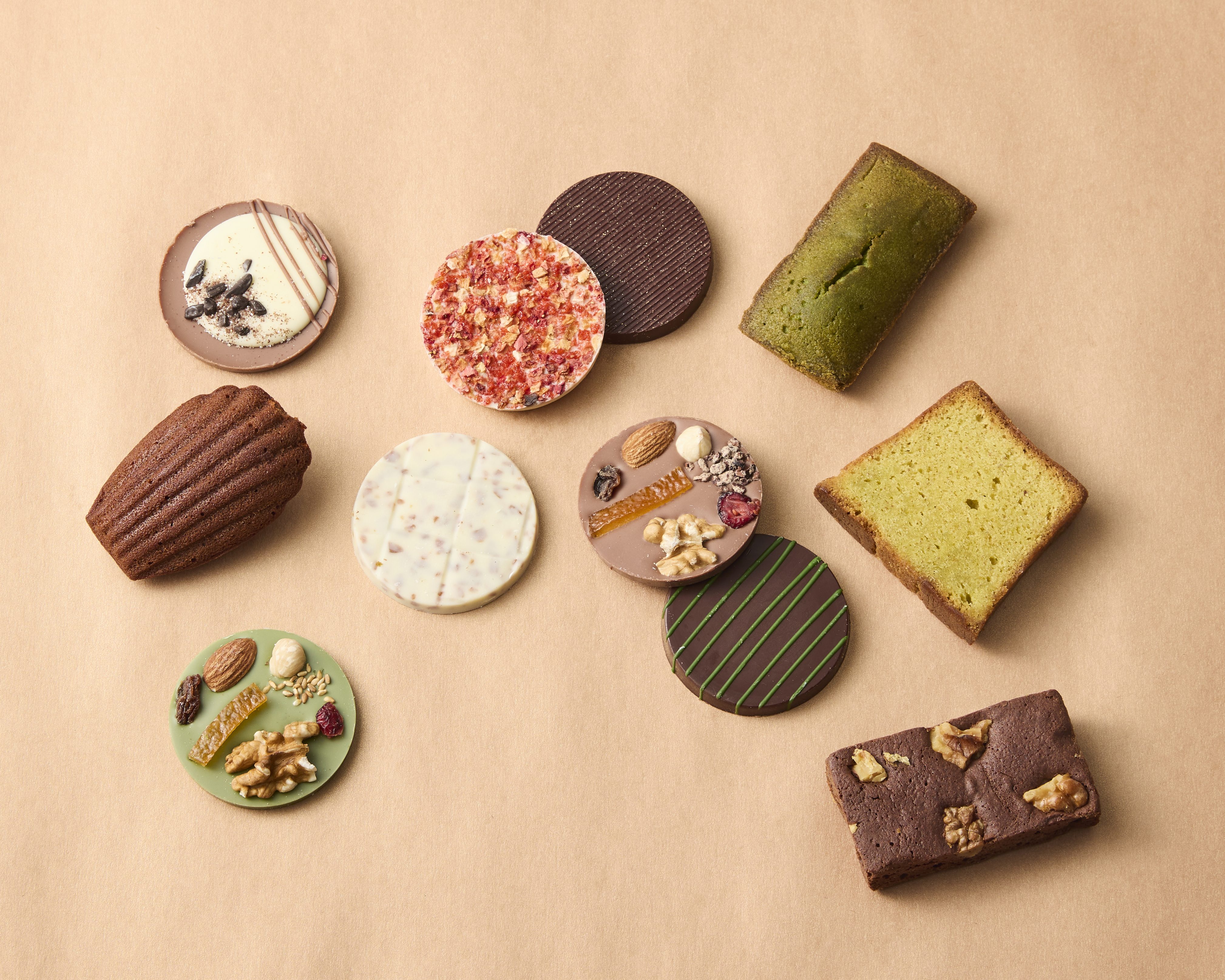 香ばしく焼き上げたブラウニーやしっとりフィナンシェ、しっかりとした食感のケーク、風味豊かなマドレーヌに加え、ショコラとフルーツをあわせたパレクッキーをセット。