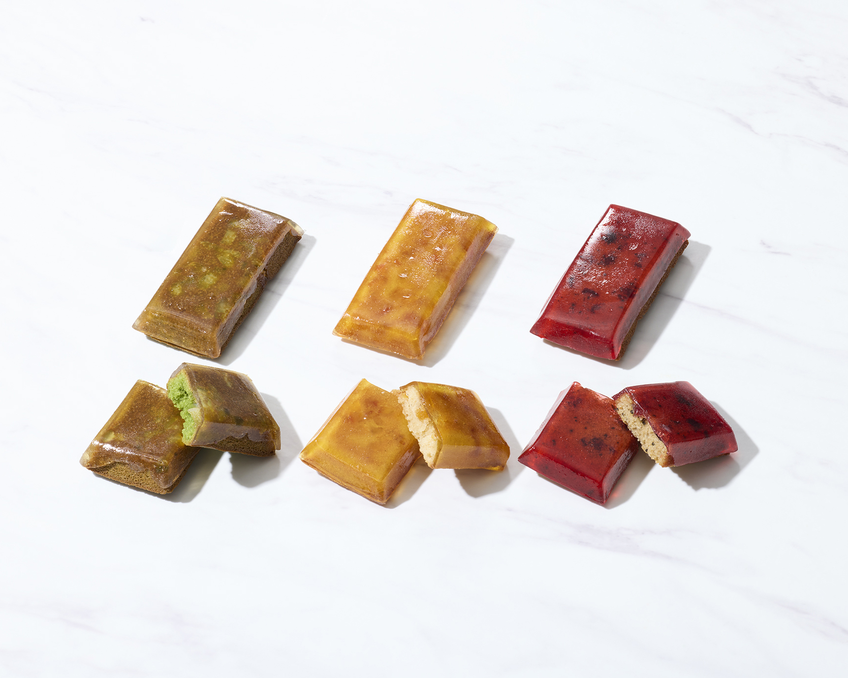 光を透かすように艶めくパートドフリュイを重ねた、春夏限定の「ジュレ フィナンシェ」。しっとりと焼き上げたフィナンシェ生地に、みずみずしい果実のジュレを重ねることで、焼き菓子でありながらも涼やかな余韻を感じていただける一品に仕立てました。