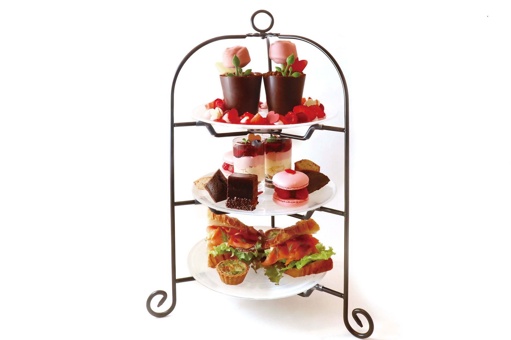 上段には限定デセール「ボヌールローズ」、中段にはショコラノワール、ベリーのマカロン、フィナンシェ、ベリーとローズヒップのヴェリーヌ、下段にはサンドイッチやミニキッシュを盛り合わせました。