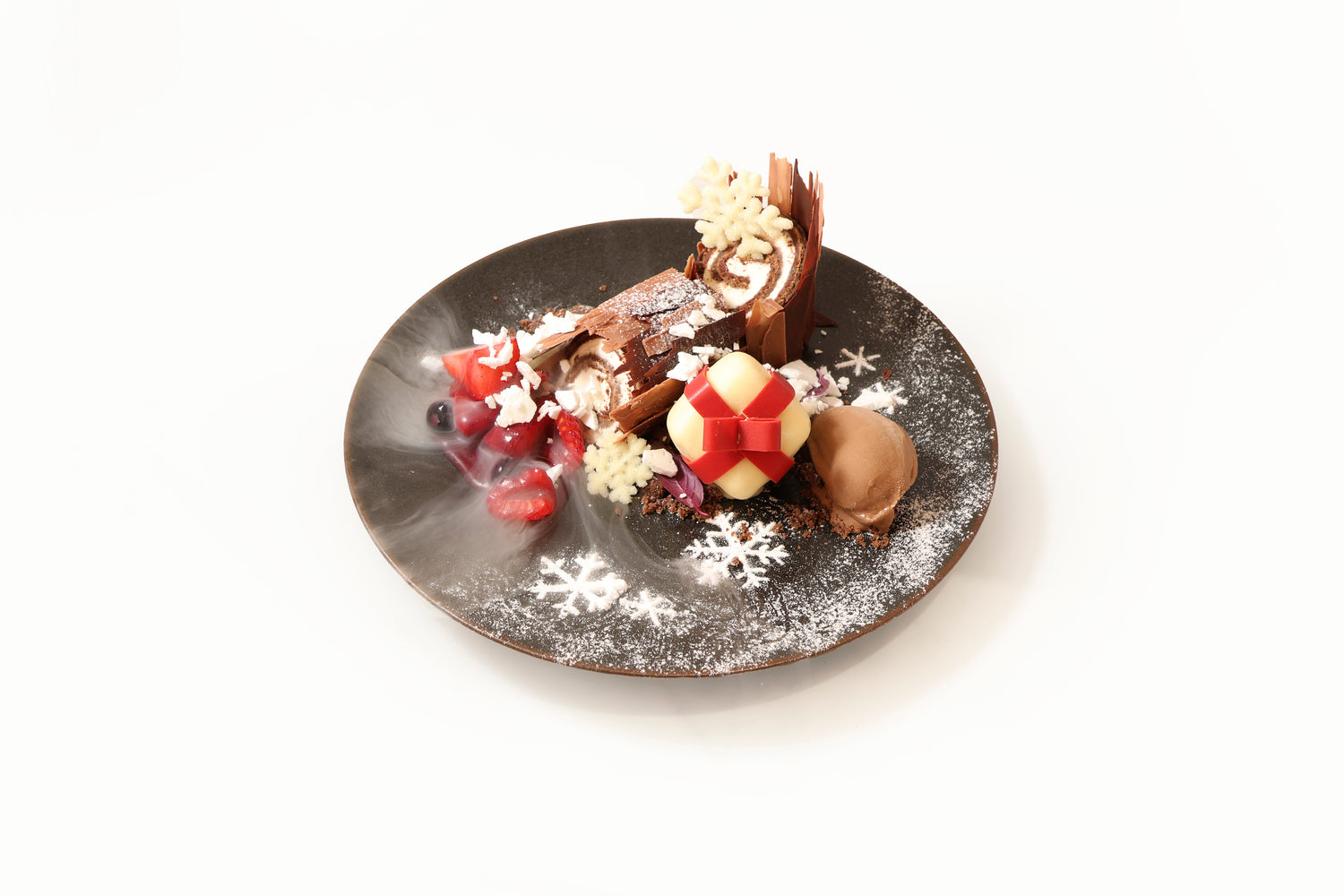 クリスマスの定番ケーキ『ブッシュドノエル』をアシェットデセールにアレンジした一皿。