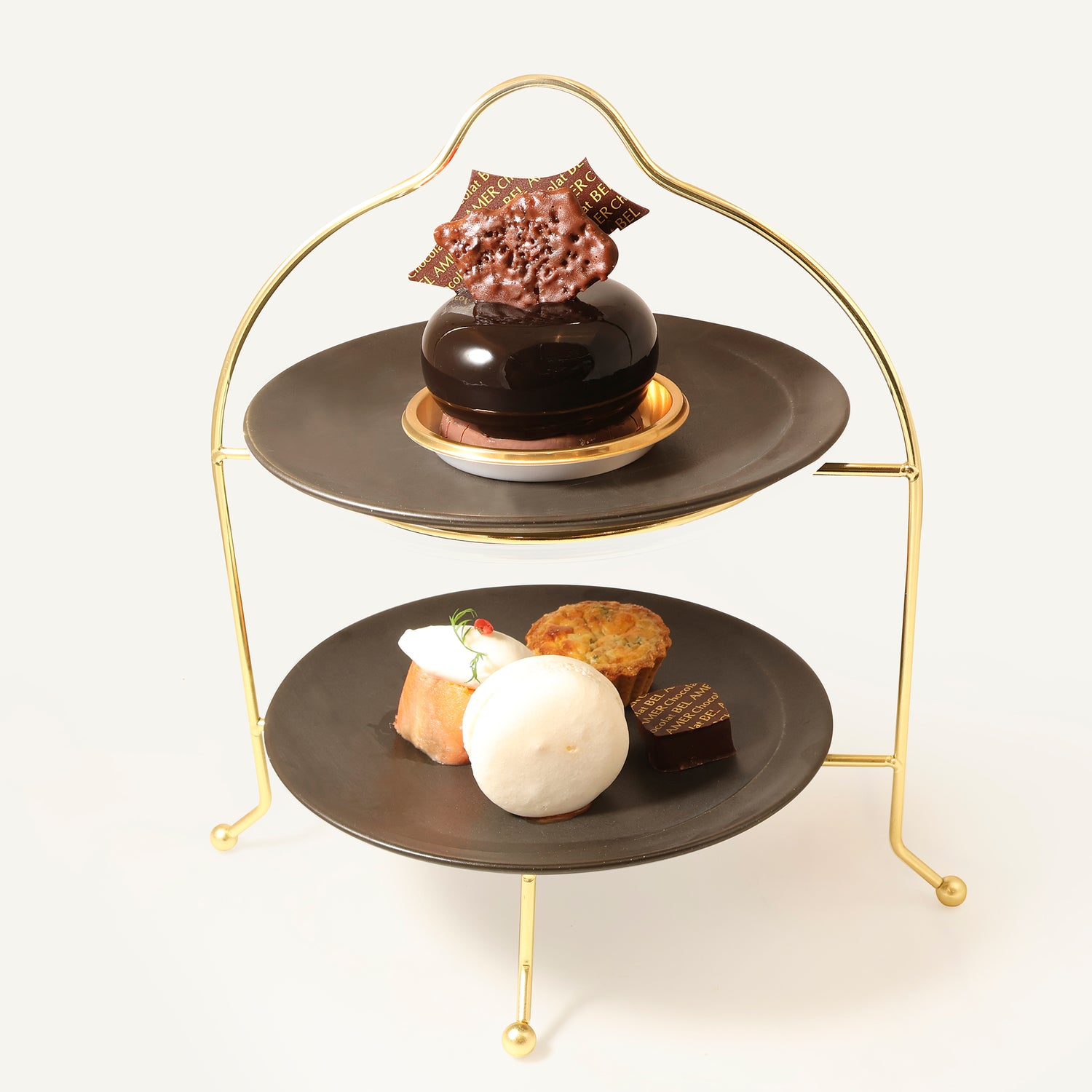 下段はフィンガーフード2種、マカロン、ボンボンショコラを盛り込んだプレート、上段にお好きなケーキをのせた2段重ねのプレートです。