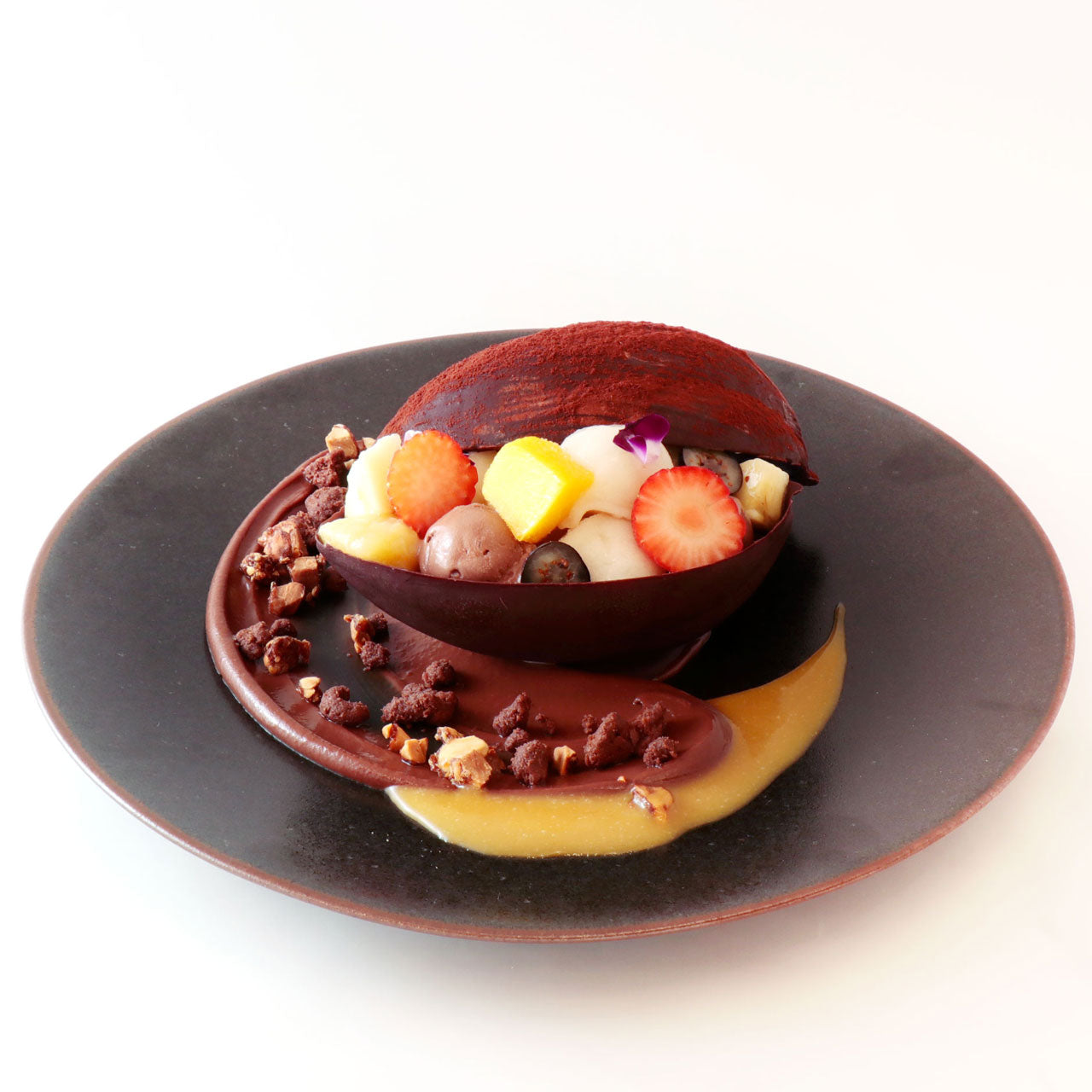 カカオの実を型どったショコラの中には、ビターチョコクリーム、クランブル、バナナソース、パッションみかんソースを詰め、カカオの実の果肉である「カカオパルプ」のソルベとチョコアイスを乗せました。