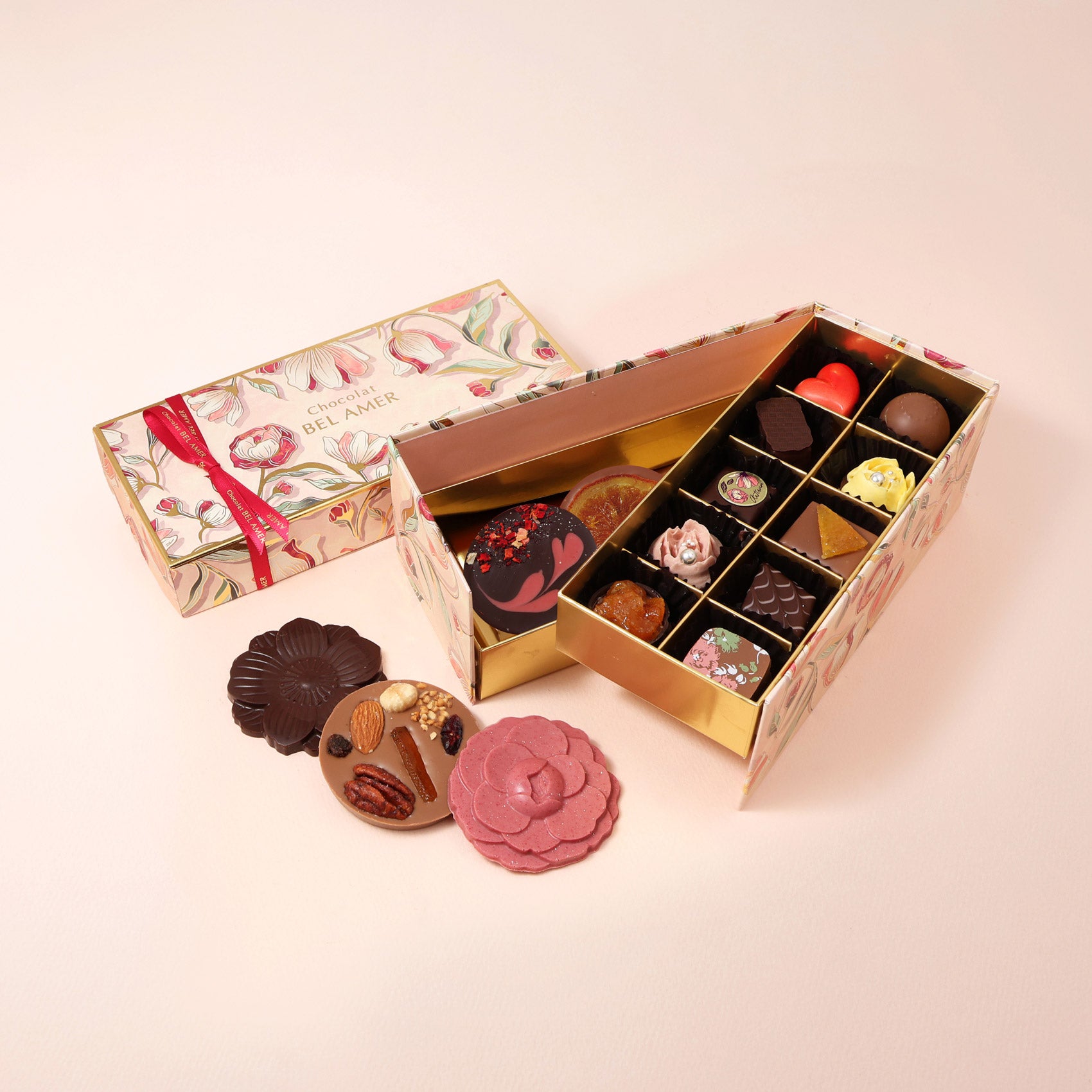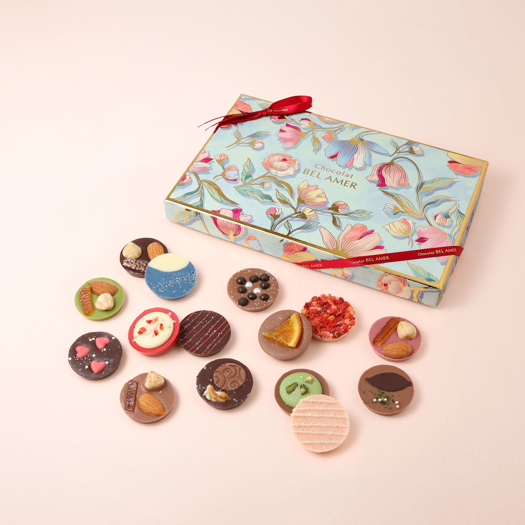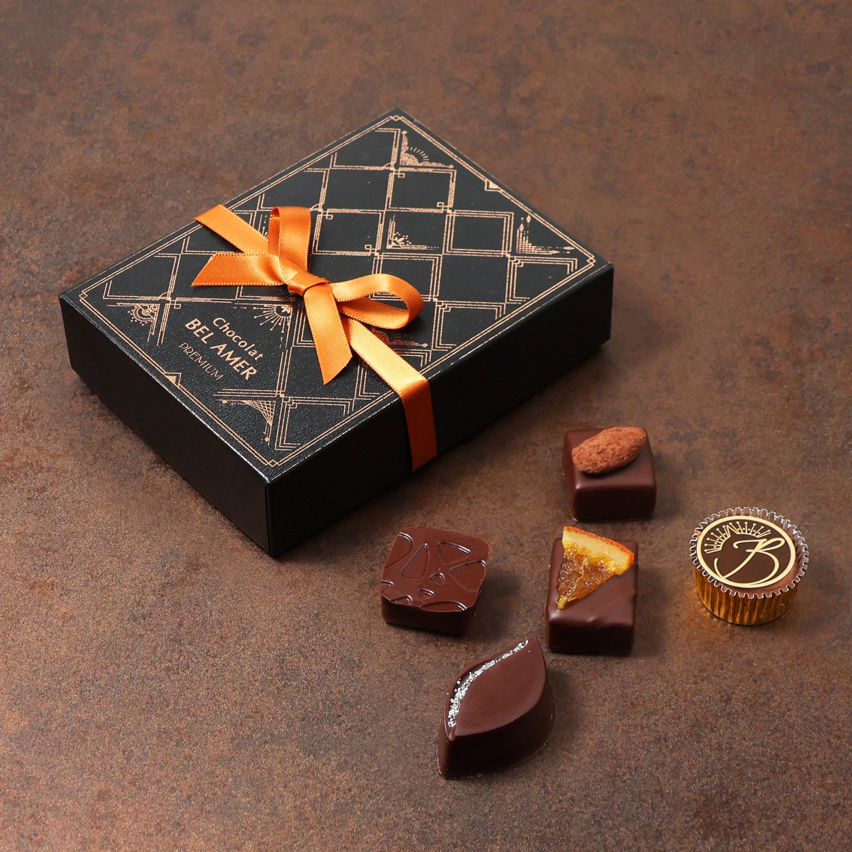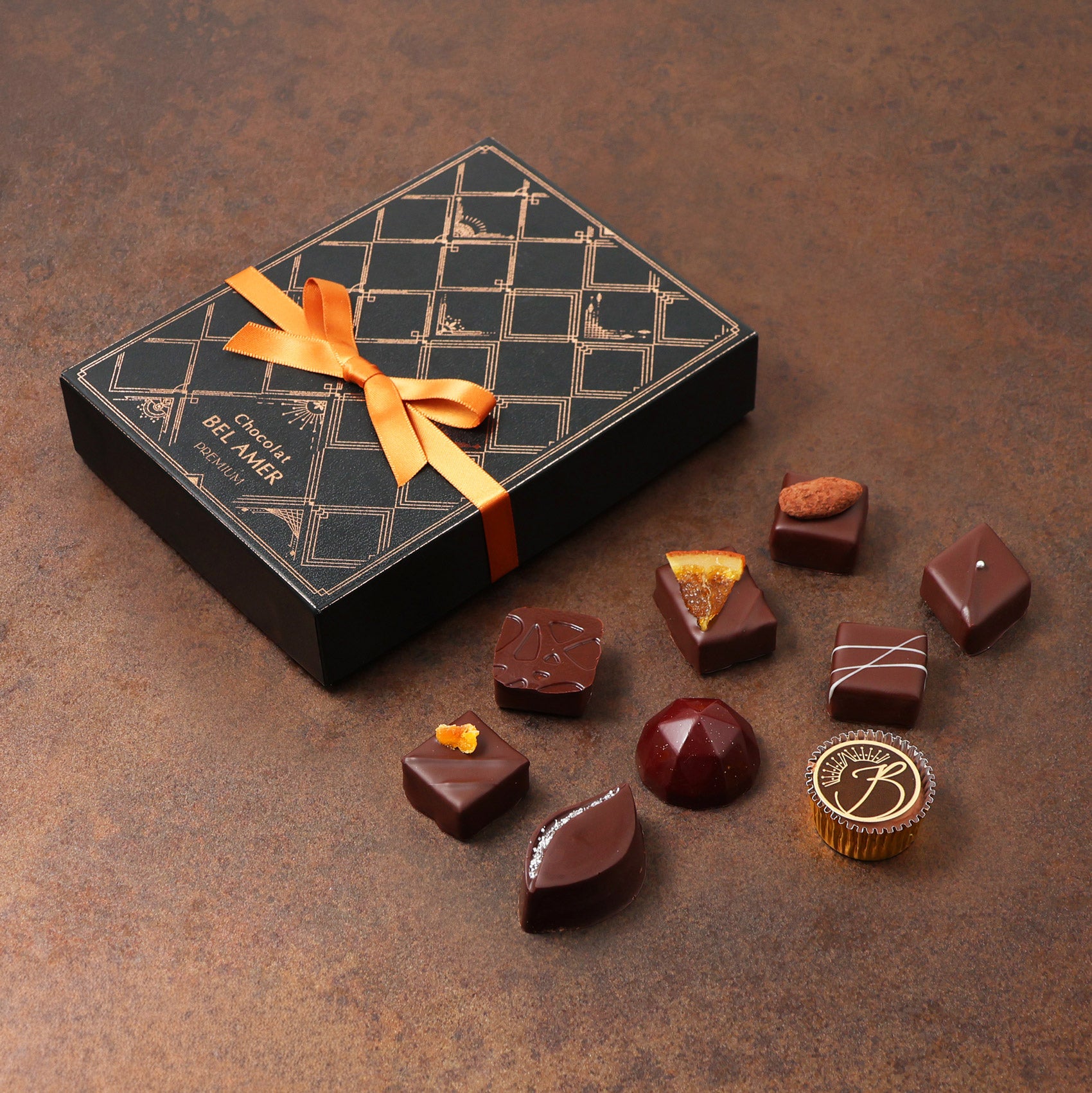 ベルアメールこだわりのチョコレートを中心に、素材と技が織りなす多彩な味わいをお楽しみいただけます。期間限定のフレーバーを加え、季節の贈りものにもふさわしい、上品なボックスに詰め合わせました。