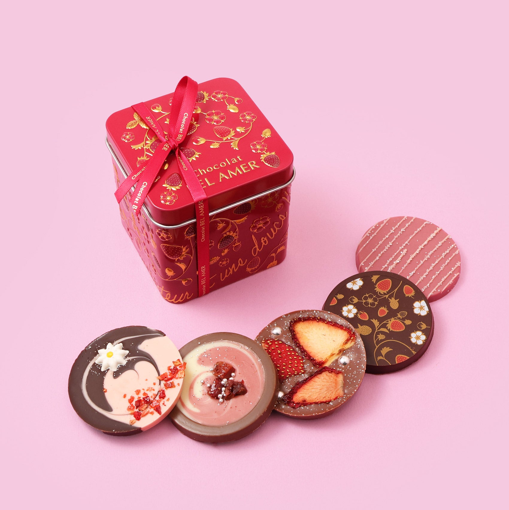 苺をイメージした、ミニサイズの板チョコレート。苺の魅力の詰まった6種類の板チョコレートを、可愛らしい苺模様の缶に詰め合わせました。ミルク、ホワイト、ビター、ルビーチョコレートなど、それぞれのチョコレートに苺の風味やアクセントを重ねた、贈りものにぴったりアイテム。