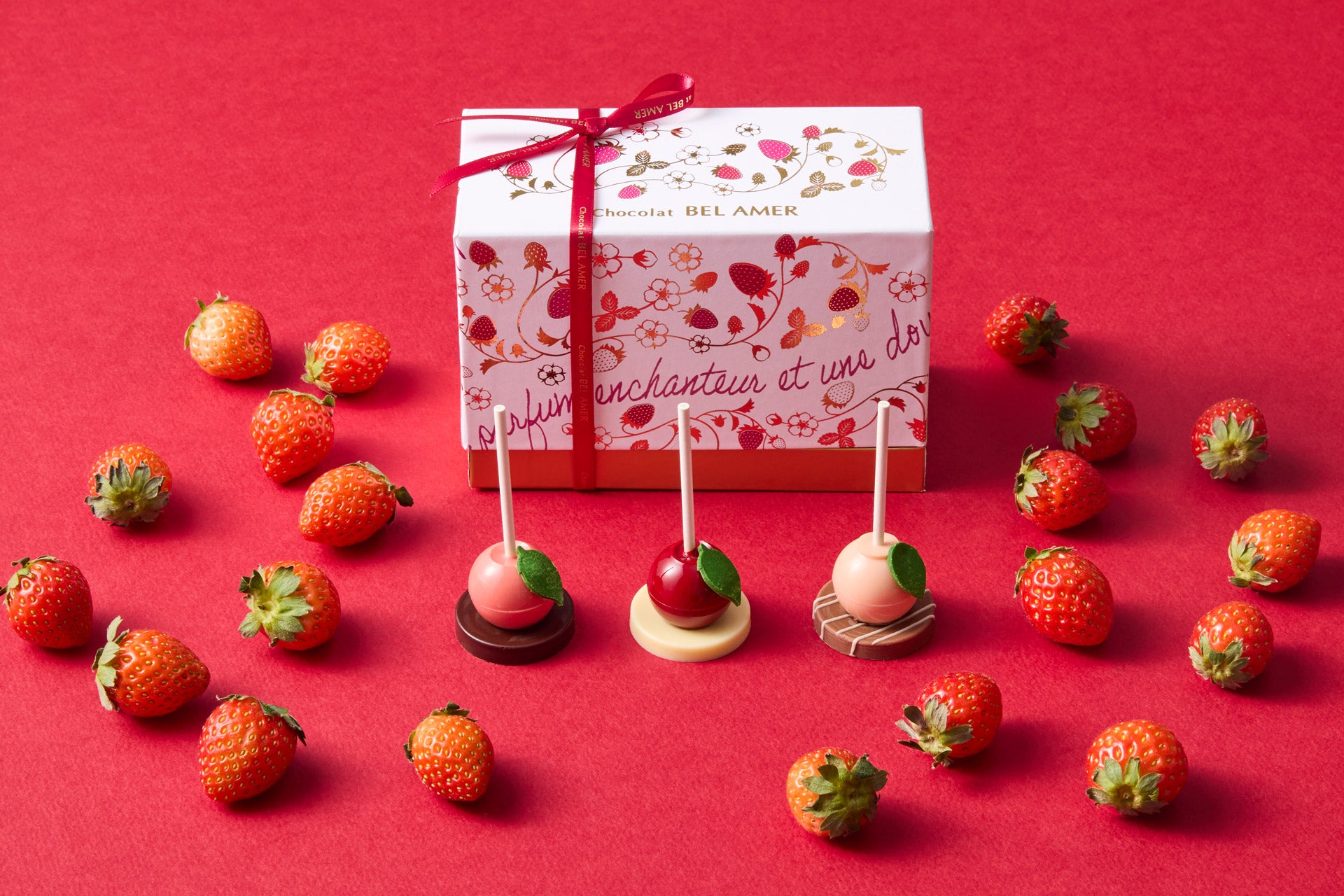 「紅ほっぺ」「とちあいか」「あまおう」日本を代表する苺の個性を艶やかに仕上げた、フルーティーで華やかな味わいの棒付きショコラ。