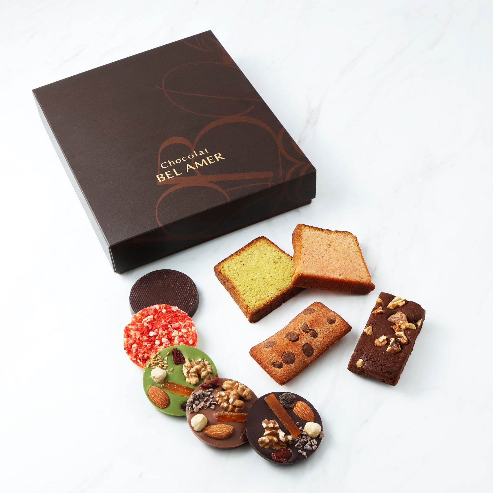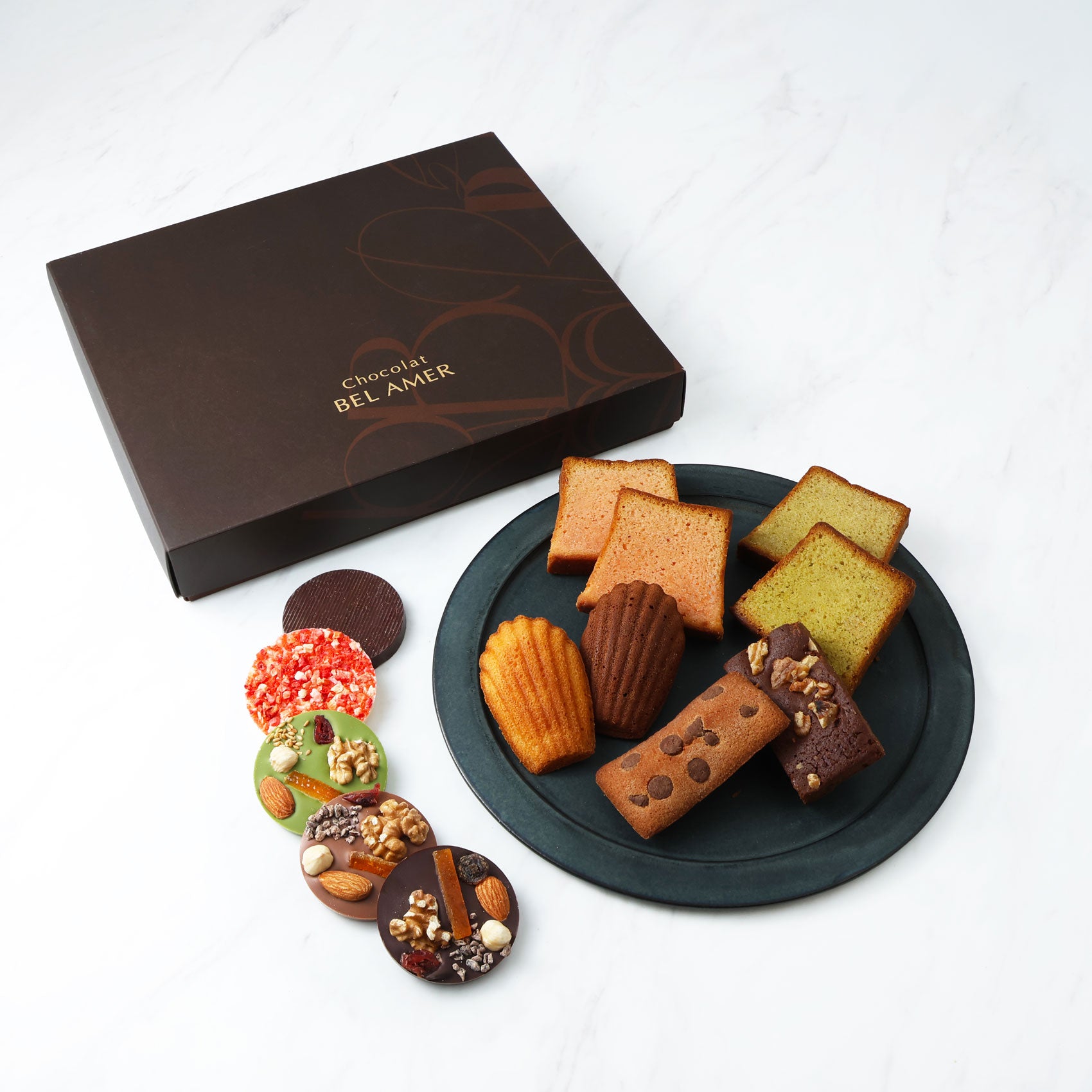 ベルアメール風にショコラでアレンジした伝統的な焼き菓子と、オリジナルの板チョコレート「パレショコラ」の詰め合わせ。