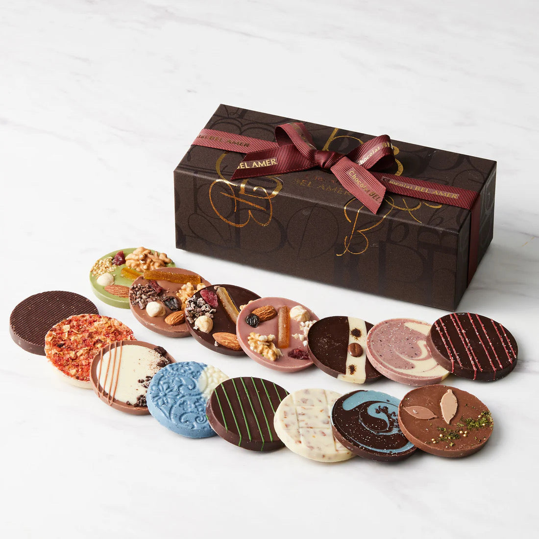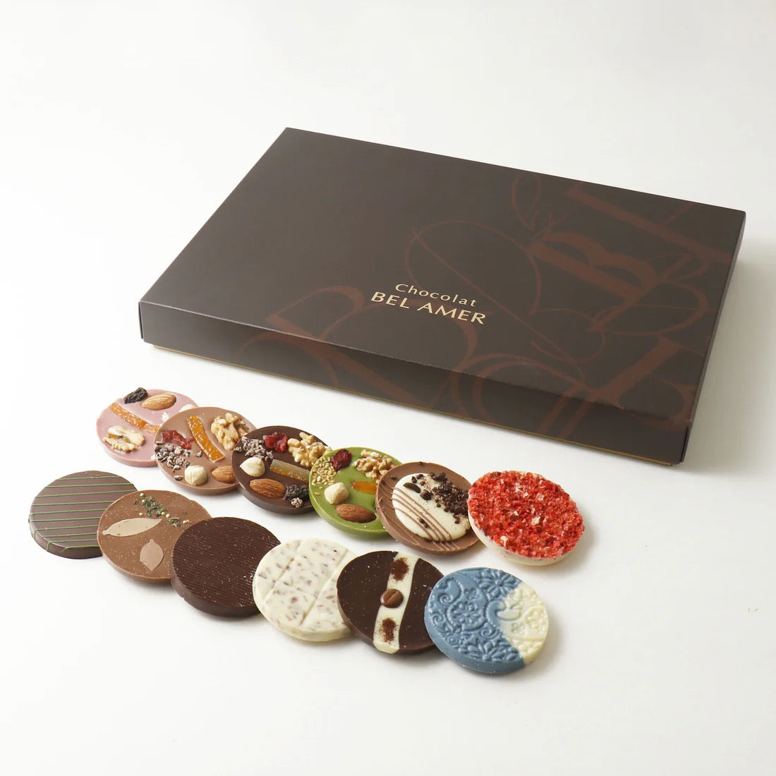 丸い板チョコレートに香ばしいナッツや旨味の凝縮されたドライフルーツをトッピング。12種それぞれの食感や風味をお楽しみいただけます。