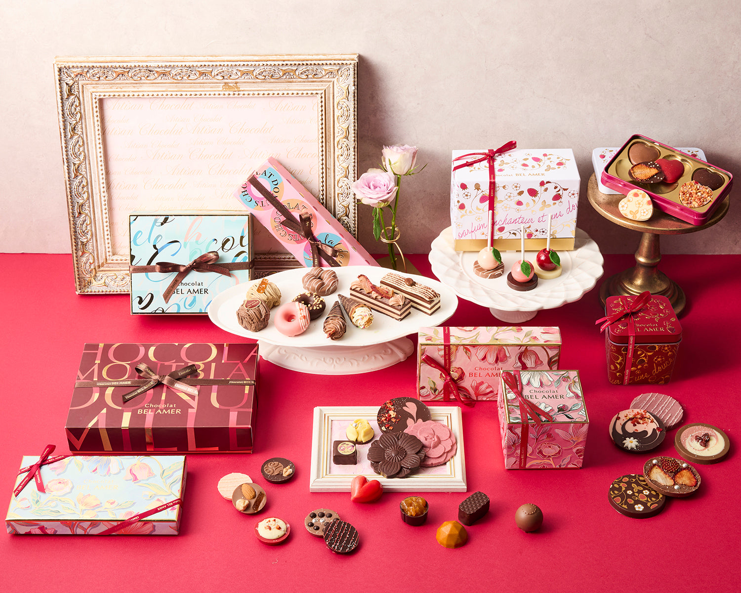 「ベルアメール」の2026 Valentine Collectionが登場!苺にこだわった華やかな苺ショコラコレクションや、クレープ・モンブラン・ミルフィーユ・ドーナツをショコラで表現したスイーツショコラなど、ベルアメールならではの多彩なチョコレートが勢揃い。
