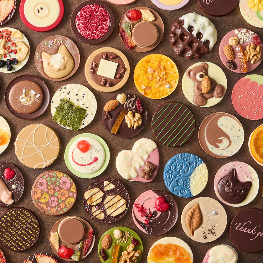 素材、厚さ、歯ごたえにこだわった、直径約6cm、厚さ約6mmの板チョコレート。ベルアメールを代表するパレショコラは豊富なバリエーションが魅力。